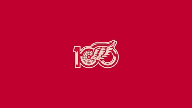 Detroit Red Wings 100-year logo banner featuring winged wheel and centennial design