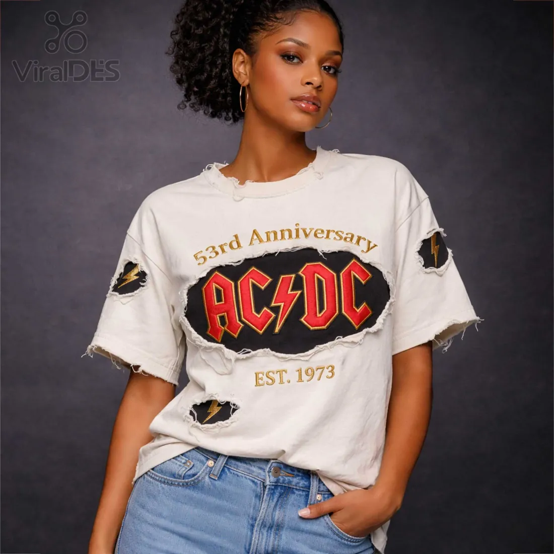 AC/DC 53rd Anniversary Vintage Distressed Embroidered Rock Band T-Shirt