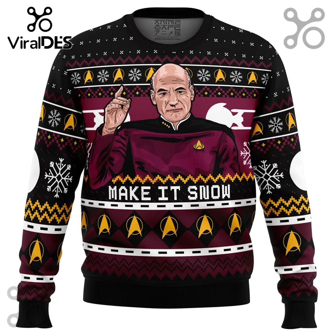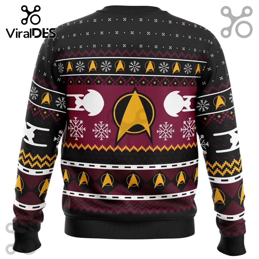 At the core of the design, a pixelated, yet unmistakably resolute, Captain Picard takes center stage, his familiar, bald head and stern expression rendered in a charmingly blocky style. He is often depicted mid-command, perhaps with an implied “Make it so!” or “Engage!” emanating from his virtual self. Surrounding this central figure is a vibrant tapestry of TNG lore, intricately knitted into the fabric. The USS Enterprise-D, in a simplified, festive iteration, might be seen soaring through fields of geometric snowflakes that cleverly incorporate Starfleet delta shields or even subtle Borg cube patterns, providing a delightful juxtaposition of holiday cheer and galactic threats. Furthermore, small, recurring motifs like Picard’s famous tea cup steaming “Earl Grey, Hot,” miniature phasers, or even Data’s iconic yellow eyes could be interspersed throughout the sweater’s landscape, inviting closer inspection and delighted recognition from fellow Trekkies. The sleeves and back often feature repeating patterns of rank pips, simplified communicators, or even the subtle outlines of a holodeck archway, ensuring that the sweater is a comprehensive tribute from every angle. The deliberately busy, often oversized nature of these graphics, coupled with a festive color palette that marries traditional Starfleet gold, red, and blue with more seasonal greens and whites, perfectly encapsulates the spirit of the ugly sweater while maintaining its proud Star Trek identity.