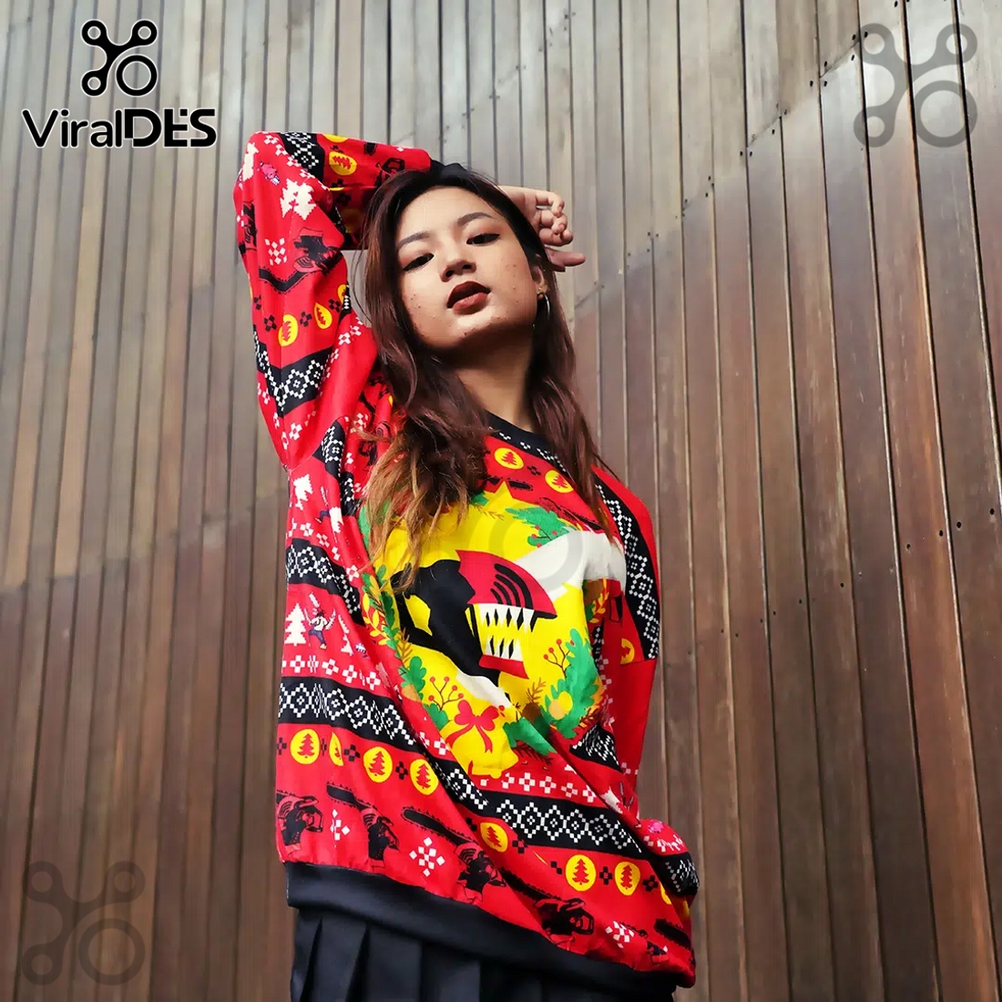 The sweater’s primary appeal lies in its unparalleled graphic narrative. The central panel brilliantly juxtaposes Denji, perhaps wielding a candy cane chainsaw, alongside a festive Pochita adorned with a tiny Santa hat, surrounded by what appear to be blood-splatter snowflakes or stylized devil horns integrated seamlessly into classic Christmas patterns. Imagine Aki Hayakawa’s stoic presence subtly woven into a snowy evergreen forest, or Power’s chaotic energy manifesting as aggressive, yet undeniably festive, reindeer charging across a field of mistletoe and chains. The color palette itself is a masterful blend, daringly integrating the series’ signature reds, blacks, and muted tones with vibrant holiday greens, whites, and shimmering golds, creating an effect that is simultaneously festive and delightfully unsettling. This isn’t just random imagery; it’s a carefully composed piece of wearable art, with every pixelated detail, every knitted stitch contributing to its overarching “ugly” charm. The intentional clash of themes – brutal devils and jolly Christmas carols – is precisely what gives the sweater its magnetic allure, distinguishing it from generic holiday wear.