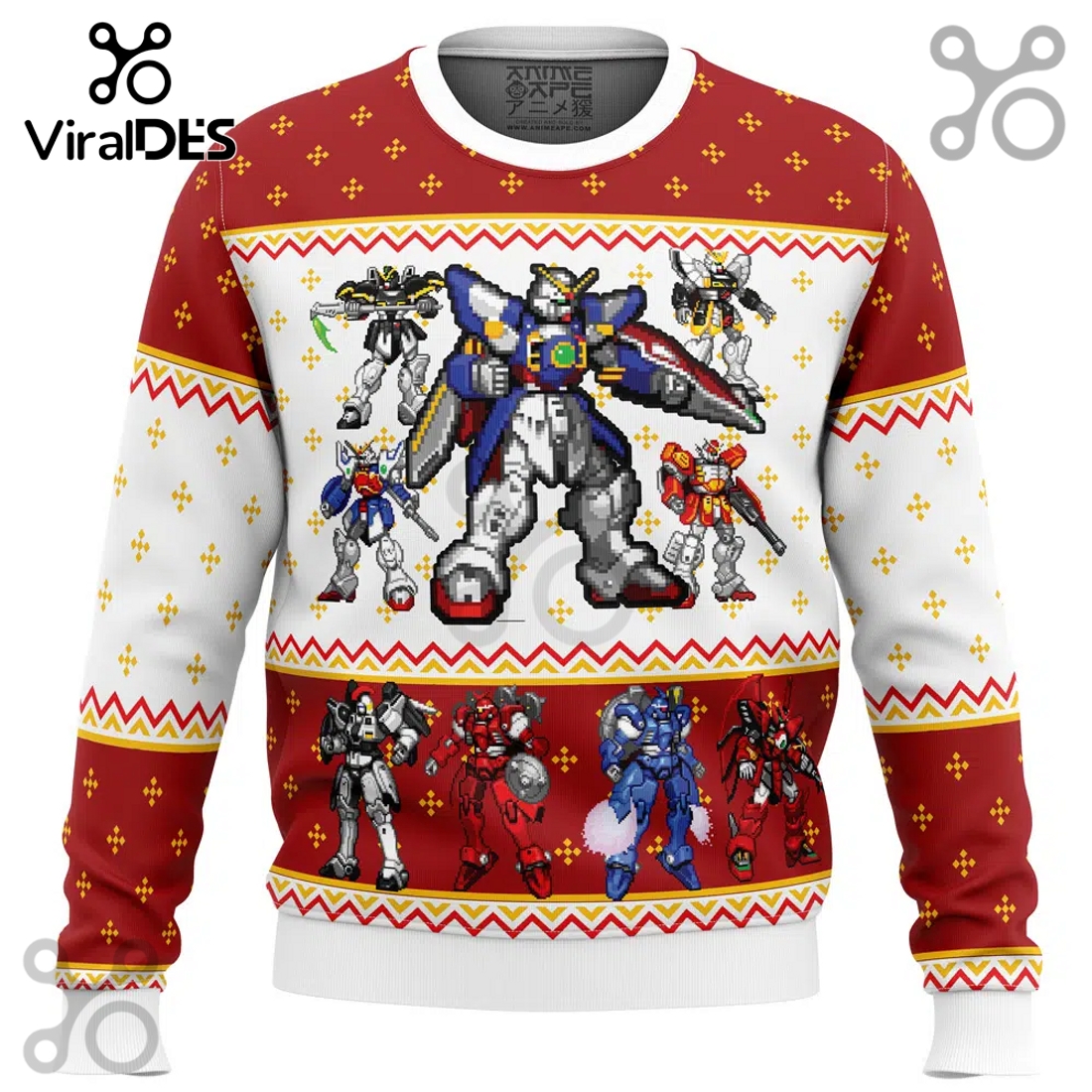 The Gundam Wing Sprites Ugly Sweater 2025 offers an unparalleled fusion of nostalgic anime appreciation and festive holiday cheer, meticulously crafted for fans who demand both comfort and a unique statement piece. This isn’t just another seasonal garment; it’s a meticulously designed tribute to the iconic – Gundam Wing- series, reimagined through a charmingly retro pixel-art aesthetic that perfectly embodies the “ugly sweater” spirit without compromising on quality or fan-specific details. Imagine a rich, deep navy knit base, providing a sophisticated canvas for a vibrant tapestry of 8-bit and 16-bit inspired Gundam sprites. The front panel proudly displays an array of the most beloved mobile suits – Wing Gundam Zero Custom with its majestic wings spread, the menacing Deathscythe Hell Custom wielding its beam scythe, Heavyarms Custom ready to unleash a barrage, Sandrock Custom with its powerful heat shotels, and the agile Altron Gundam. Each machine is rendered in a delightful, chunky pixelation, utilizing a full spectrum of colors—from Wing’s stark white and blue to Deathscythe’s eerie black and green, all interwoven with traditional holiday reds, greens, and whites in deliberate, playfully chaotic patterns.