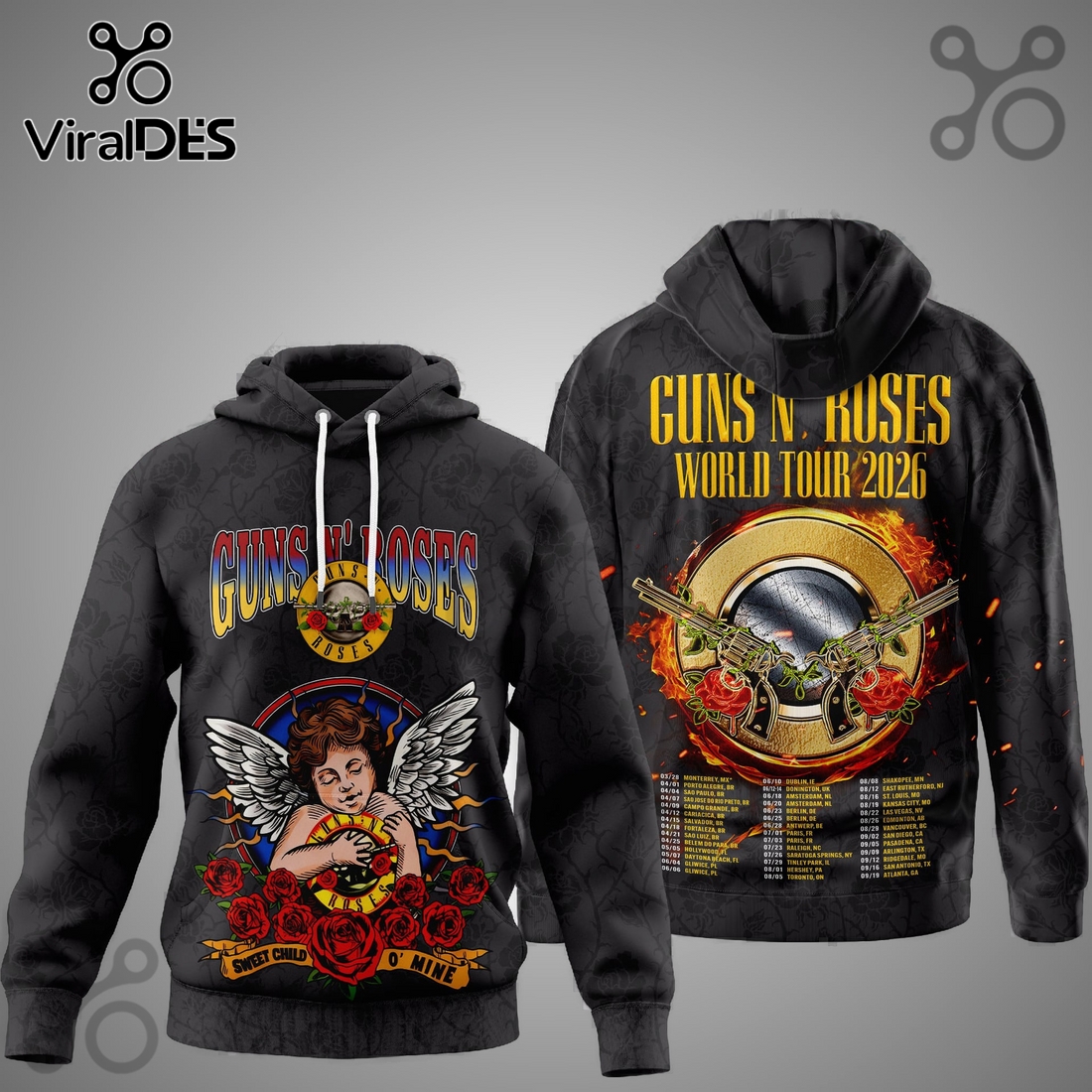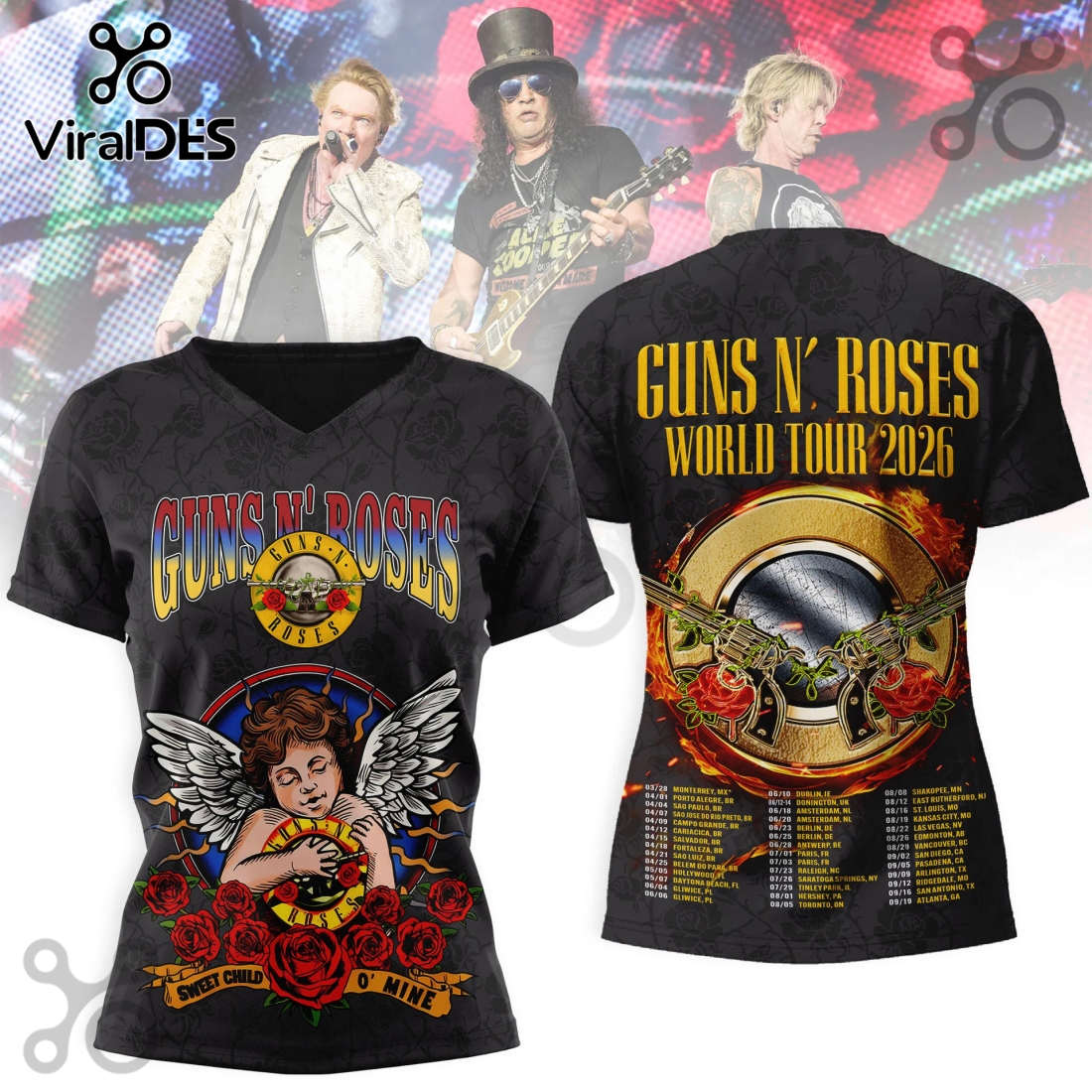 The design itself is a masterpiece of fan service and aesthetic brilliance, tailored specifically for the forthcoming 2026 World Tour. On the front, a composite of electrifying stage imagery, perhaps a powerful snapshot of the band mid-performance, bursts forth with vibrant, almost hyper-realistic color. The legendary GNR logo, rendered with a metallic sheen or distressed texture, serves as the centerpiece, radiating an undeniable aura of rock royalty. Subtle details like intricate rose patterns, guitar fretboards, or microphone stands are strategically placed to enhance the 3D depth, drawing the eye into a world of visual complexity. The back of the shirt, equally significant, typically showcases an artfully arranged list of projected tour cities and dates, ensuring authenticity and providing fans with a tangible memento of an anticipated global event. This attention to detail extends to the overall color palette, which blends classic rock-and-roll dark tones β deep blacks, charcoal greys, and midnight blues β with explosive bursts of crimson, electric yellow, or stark white, perfectly capturing the band’s raw energy and rebellious spirit.