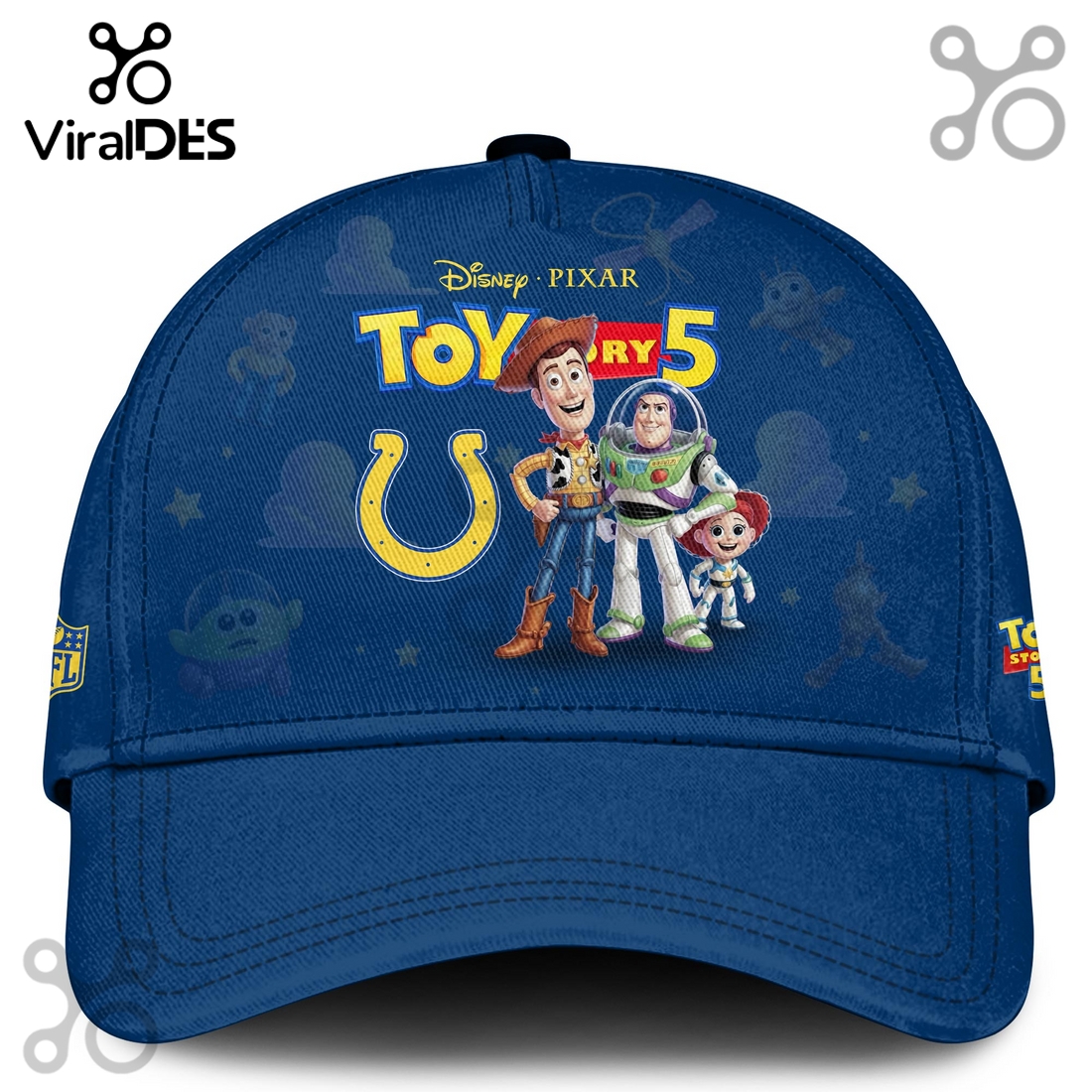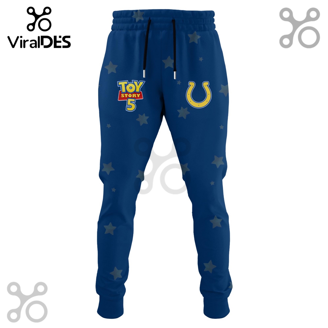 What truly sets this limited edition set apart is its imaginative design, which masterfully intertwines the iconic Indianapolis Colts branding with beloved characters from Toy Story 5. The Colts’ unmistakable royal blue serves as the dominant backdrop, boldly featuring the classic horseshoe logo prominently on the chest of the hoodie, rendered with crisp detail. This is cleverly integrated with fresh, dynamic illustrations of Toy Story characters like Woody, Buzz Lightyear, and Jessie, reimagined in spirited poses that suggest their own enthusiastic support for the Colts, perhaps even donning miniature team apparel or interacting playfully with football elements. These unique character graphics are not just confined to the hoodie; subtle yet engaging details, such as a smaller character emblem or a collaborative wordmark, might be strategically placed on the jogger’s thigh or calf, ensuring a cohesive and thoughtfully designed ensemble. This artistic fusion speaks directly to a dual fanbase, allowing wearers to proudly showcase their loyalty to the Indianapolis Colts while simultaneously celebrating the enduring charm and adventurous spirit of the Toy Story universe, creating a truly unique visual statement that transcends conventional sports apparel. The “Limited” designation underscores its exclusivity, appealing to collectors and fans who desire merchandise that stands out from the mass market, guaranteeing that this isn’t just another piece of fan gear, but a rare and cherished item. This set perfectly meets the needs of potential customers seeking ultimate comfort for lounging or casual wear, a stylish and unique way to express their dual fandoms, and a high-quality, durable product that offers a sense of exclusivity and collector’s value, making it an ideal gift or a prized personal acquisition for any Colts or Toy Story enthusiast.