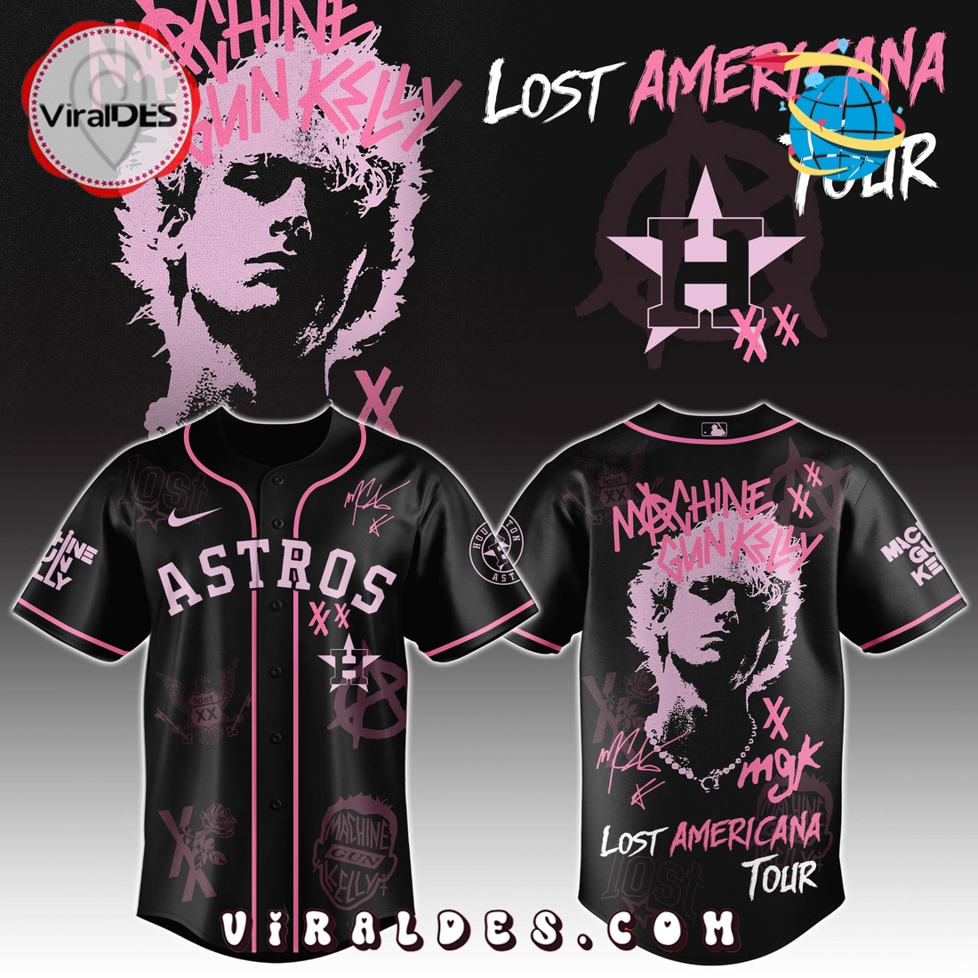 Visually, the jersey is a masterclass in collaborative design. While it proudly features the iconic Houston Astros branding, including a stylized variation of their star and βHβ logo, these elements are intelligently reinterpreted through MGKβs artistic lens. Expect a color palette that subtly integrates MGK’s signature punk-rock influences β perhaps an unexpected pop of vibrant pink or an edgy black base contrasted with the traditional Astros orange and navy. The team name or a custom “Astros” script across the chest might be rendered in a unique, distressed font that echoes MGK’s raw energy, moving beyond conventional sports typography. Details could include embroidered patches on the sleeves that fuse an Astros design with a subtle MGK insignia, or a custom number on the back, perhaps significant to MGK himself, executed in a premium tackle twill with a distinct textural quality. Every stitch, every appliquΓ©, and every graphic is engineered to tell a story of two powerful entities converging, creating a garment that is both instantly recognizable as an Astros jersey and unmistakably touched by MGKβs personal brand.