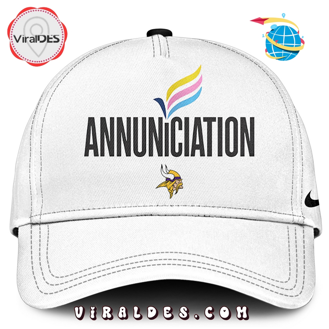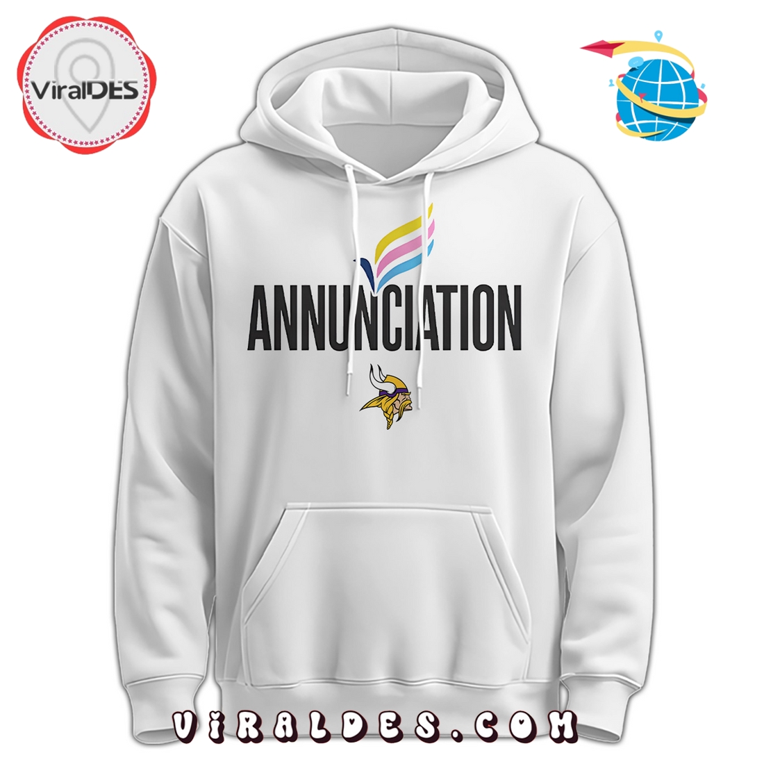The Minnesota Vikings NFL Annunciation Hoodie And Pant set combines sleek design, meaningful detail, and a heartfelt backstory. The base color is bright white, making it versatile for casual wear or game-day style. On the hoodieβs front, the bold word βAnnunciationβ appears in black, accented with a colorful emblem above and the Vikings logo beneath. The back delivers a powerful message with phrases like Be Kind, Be Respectful, Be Inclusive, Be My Best Self, Be Brave, each in a different color to emphasize positivity and resilience. The pants feature a matching design, with text and emblem on one side and the Vikings logo on the other, tied together with an adjustable waistband for comfort. Every element, from the soft lightweight fabric to the hoodieβs roomy kangaroo pocket, is designed for ease and durability. The cap option completes the look, allowing fans to wear a coordinated set that blends team pride with deeper meaning.