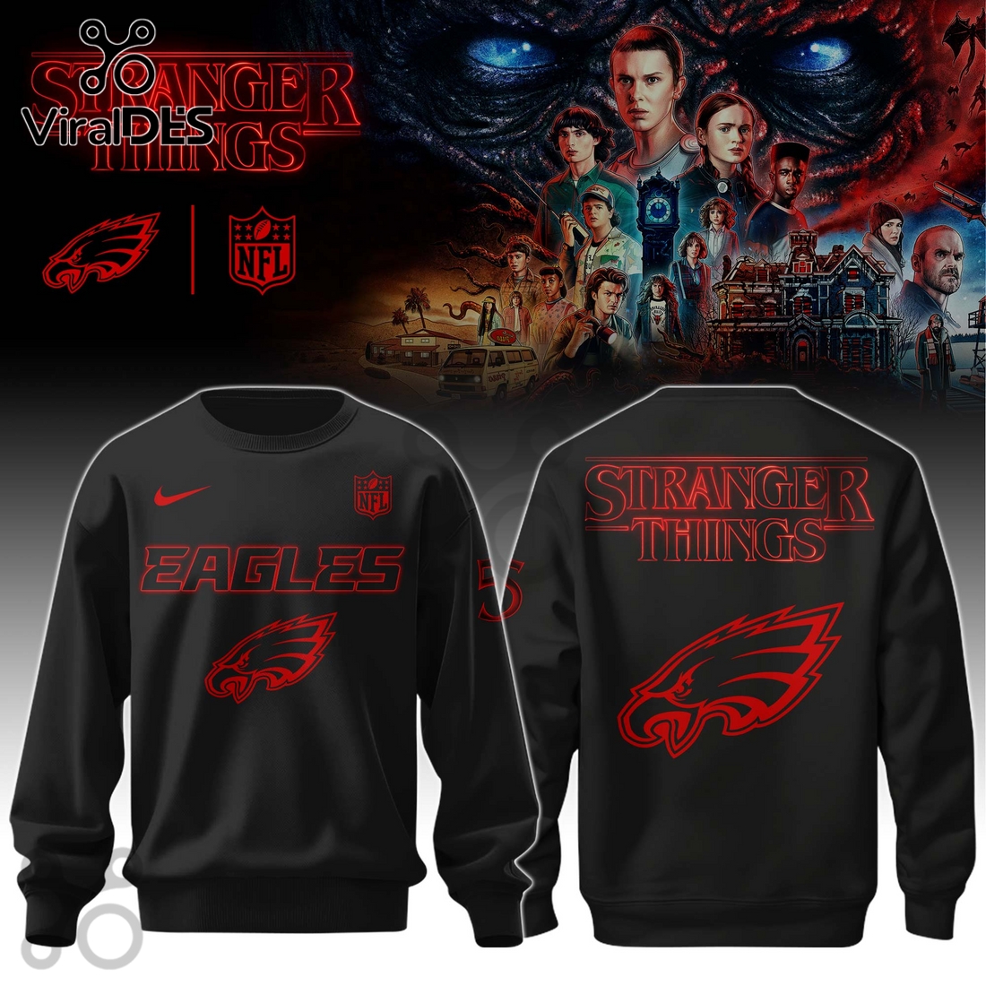 This distinctive piece of apparel brings together the fierce loyalty of Philadelphia Eagles fans with the captivating nostalgia and thrilling mystery of Netflix’s Stranger Things. It stands as a testament to unparalleled fandom, offering a tangible fusion of two powerhouse cultural phenomena. The design immediately captures attention with its meticulously integrated graphics, showcasing the iconic Philadelphia Eagles logo reimagined through the lens of the Upside Down. Imagine the classic Eagles silhouette, perhaps subtly distressed or outlined with an eerie, reddish glow, reminiscent of the otherworldly dimension from Hawkins. Surrounding elements might include subtle references to Stranger Things lore, such as a stylized Demogorgon silhouette emerging from the shadows, or the show’s distinctive retro-futuristic font spelling out “Eagles” or “Birds.” The color palette likely grounds itself in the Eagles’ traditional dark green, black, and silver, but infused with the muted, atmospheric tones, or even the vibrant, neon accents characteristic of 1980s aesthetic found within the series. This isn’t just a simple logo overlay; it’s an artistic blend that tells a story, making it instantly recognizable to fans of both worlds while creating a unique visual narrative.