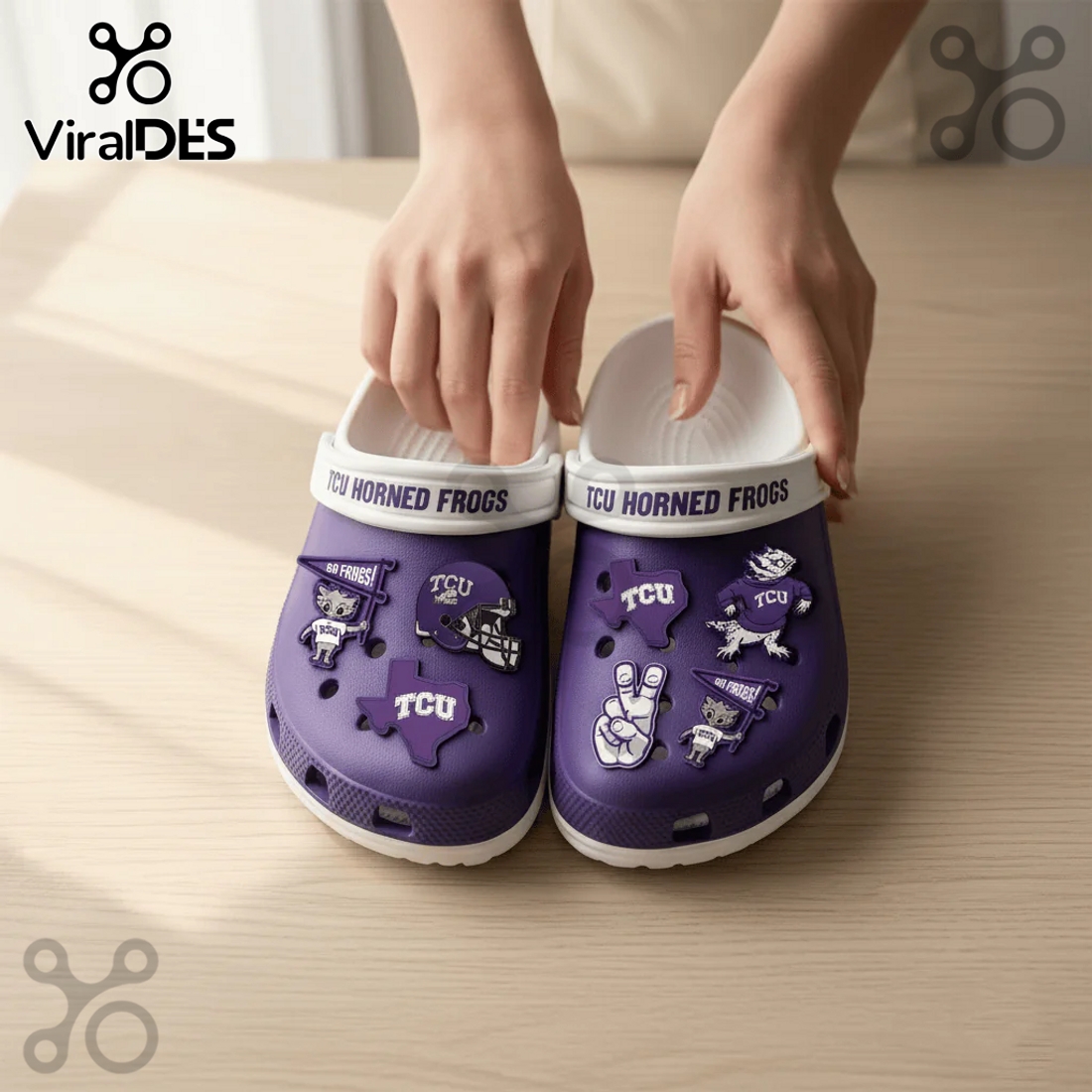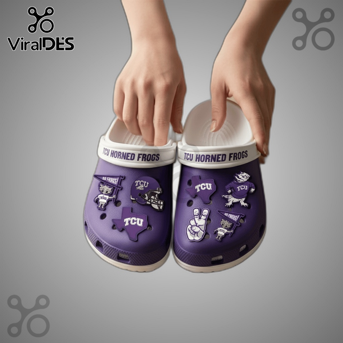 What truly sets this premium offering apart is its comprehensive and officially licensed TCU Horned Frogs branding. The clogs are rendered in the unmistakable deep purple and white colors of the university, often featuring the distinctive Horned Frog logo prominently displayed on the upper part of the shoe and integrated into the footbed, ensuring that every step you take proudly proclaims your loyalty. This isn’t just a simple logo application; the branding is integrated with precision and high-quality graphics that resist fading and wear, maintaining their sharp, vibrant appearance over time. Adding another layer of personalized fandom, the Crocs come generously adorned with a curated collection of Jibbitzβ’ Charms, all exclusively themed for the TCU Horned Frogs. Imagine an array of intricately designed charms featuring the fierce Horned Frog mascot in various poses, bold “TCU” lettering, iconic sports equipment like miniature football helmets or basketballs, and spirited phrases such as “Go Frogs!” or “Fear The Frog.” These charms are not just decorative; they allow for a degree of customization that further cements your individual connection to the team, transforming a comfortable pair of shoes into a unique canvas of school pride. Each charm is securely fitted, built to withstand daily adventures without detaching, making the entire package robust and reliable.