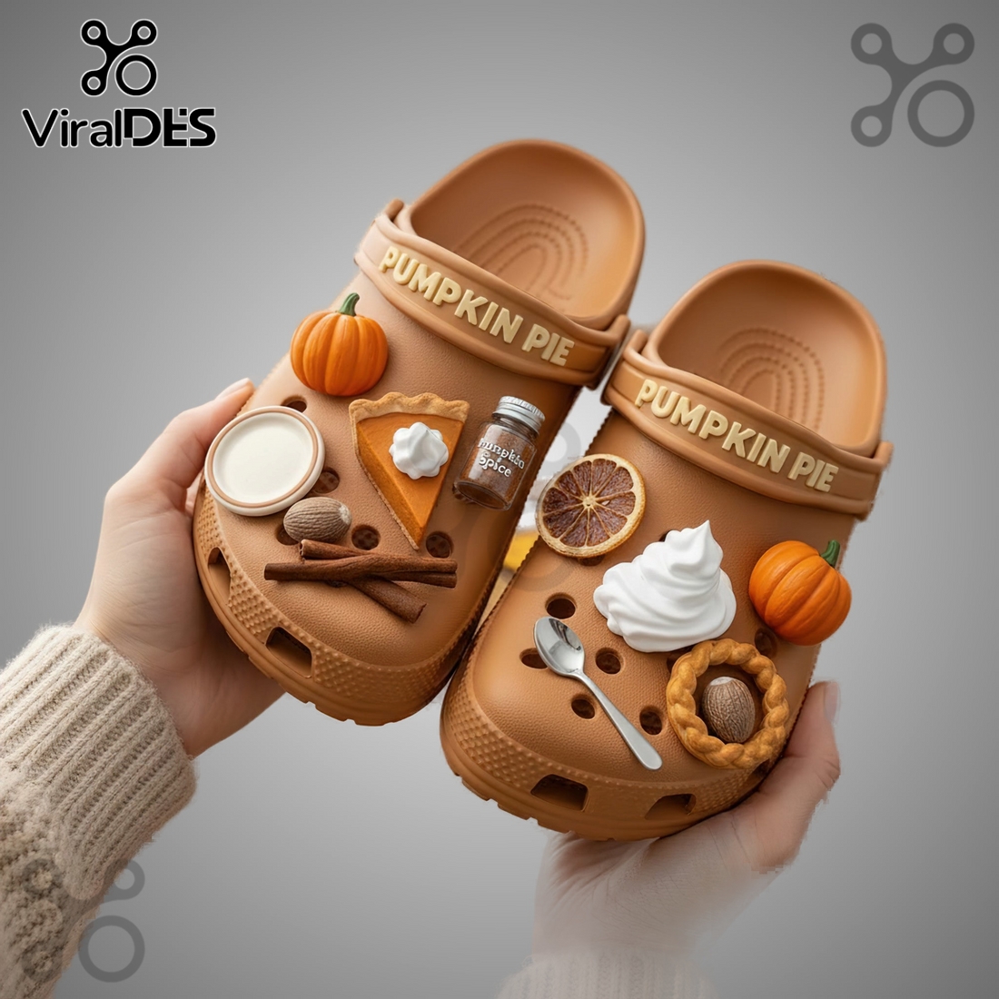 The Pumpkin Pie Premium Crocs Clogs With Charms offer a delightful fusion of iconic comfort and seasonal charm, presenting a unique footwear option for those who appreciate both practicality and playful expression. These aren’t just ordinary clogs; they embody the cozy, inviting spirit of autumn’s favorite dessert, rendered in a distinctive design that immediately catches the eye. The clogs themselves feature a rich, deep orange hue, meticulously chosen to mimic the perfectly baked filling of a classic pumpkin pie, infused with subtle undertones of golden crust and warming spices. This vibrant base color serves as the canvas for what truly makes this product special: its premium detailing and an array of thematic charms.