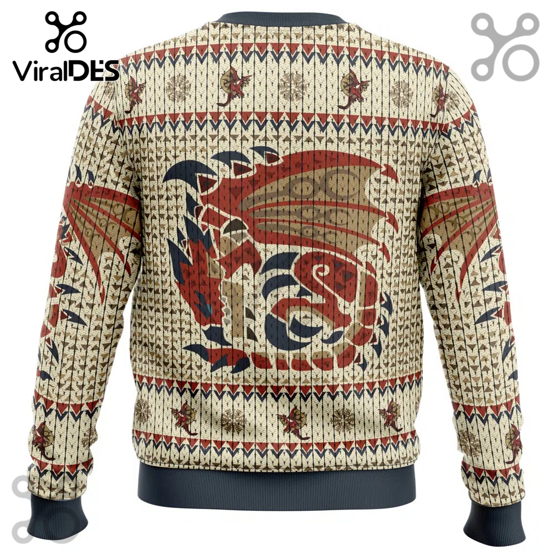 The Rathalos Monster Hunter Ugly Sweater 2025 presents a meticulously designed garment, uniquely fusing the thrilling world of Capcom’s iconic franchise with the cherished, often comical, tradition of holiday ugly sweaters. This piece isn’t just clothing; it’s a wearable declaration of fandom, an immediate conversation starter, and a genuinely warm addition to any winter wardrobe, perfectly suiting fans looking to display their passion during festive gatherings. Its core appeal lies in a striking, central depiction of the formidable Rathalos, rendered in a charmingly pixelated or chunky knit style that deliberately captures the aesthetic of classic video game sprites while adhering to the signature “ugly sweater” visual language. The mighty Fire Wyvern is often shown mid-flight or perched atop a snow-dusted peak, wings spread in defiance, perhaps with subtle, stylized flames emanating, all meticulously woven into the fabric.