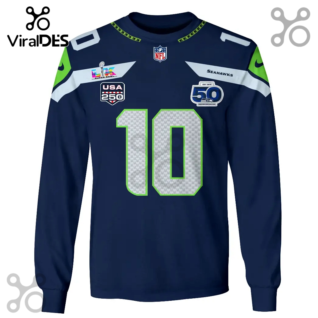 Complementing this, the stylized “Kupp 10” graphic, representing Cooper Kupp’s legendary Super Bowl LVI performance, is integrated with dynamic vitality. This unique combination acts as a powerful conversation starter, immediately distinguishing the wearer from the crowd of typical fan gear. It speaks to a fan who recognizes the indelible impact of players and monumental games across the league, even if their primary allegiance beats fiercely for the Seahawks. The Super Bowl LVI championship emblem, along with the “50th Anniversary” designation, are not flat decals but rather intricate, full-color compositions that seamlessly wrap around the entire hoodie, from the front and back to the sleeves and hood. This all-over print ensures the garment tells a multifaceted story from every angle, with the “50th Anniversary” motif adding a layer of commemorative depth, perhaps symbolizing a broader golden era of football, a personal milestone of fandom, or simply a sophisticated design flourish that elevates the garment beyond a mere team souvenir. The advanced sublimation process ensures the colors remain brilliant and fade-resistant even after numerous washes, binding the dye to the fabric fibers and guaranteeing your unique statement piece retains its visual impact for years to come.