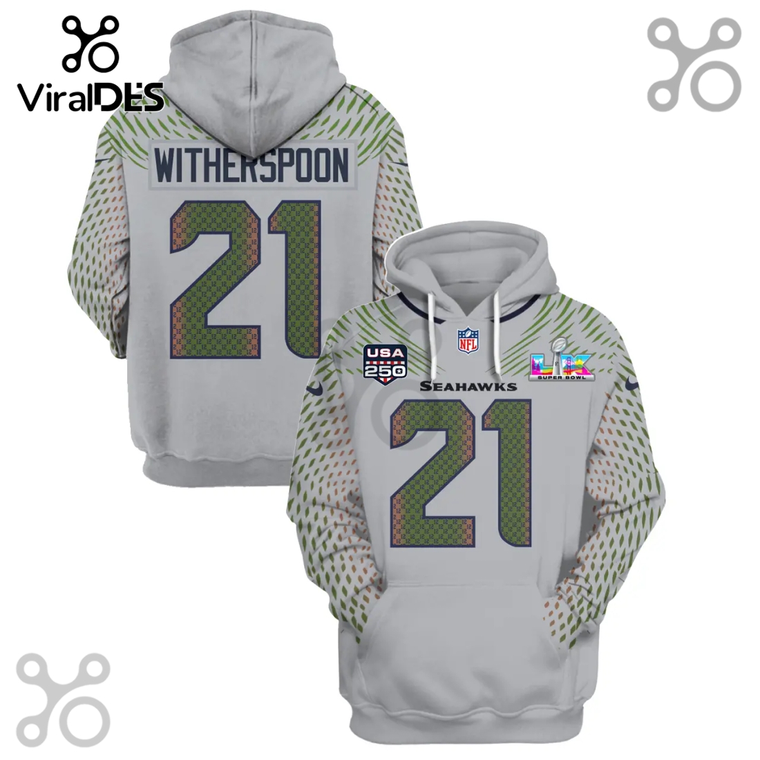 The Seattle Seahawks Witherspoon 21 Football Jersey 3D Pullover Hoodie presents an unparalleled opportunity for fans to embrace their team loyalty with a blend of game-day aesthetics and everyday comfort. This unique apparel piece skillfully merges the iconic visual elements of a professional football jersey with the practical warmth and relaxed fit of a classic pullover hoodie, creating a versatile garment perfect for myriad occasions. At its core, the product showcases the vibrant spirit of the Seattle Seahawks, immediately identifiable through its official team colors β the distinctive Seahawks blue, vivid action green, and contrasting gray and white accents. Prominently featured is the name “Witherspoon” and the number “21,” meticulously integrated into the design, allowing supporters to proudly represent a specific player while channeling the collective energy of their favorite NFL franchise.