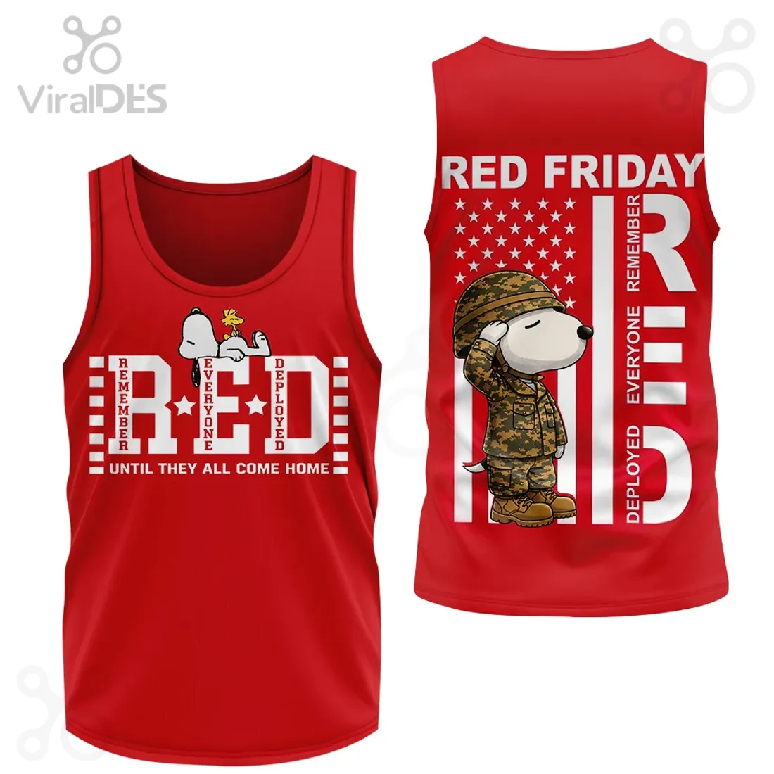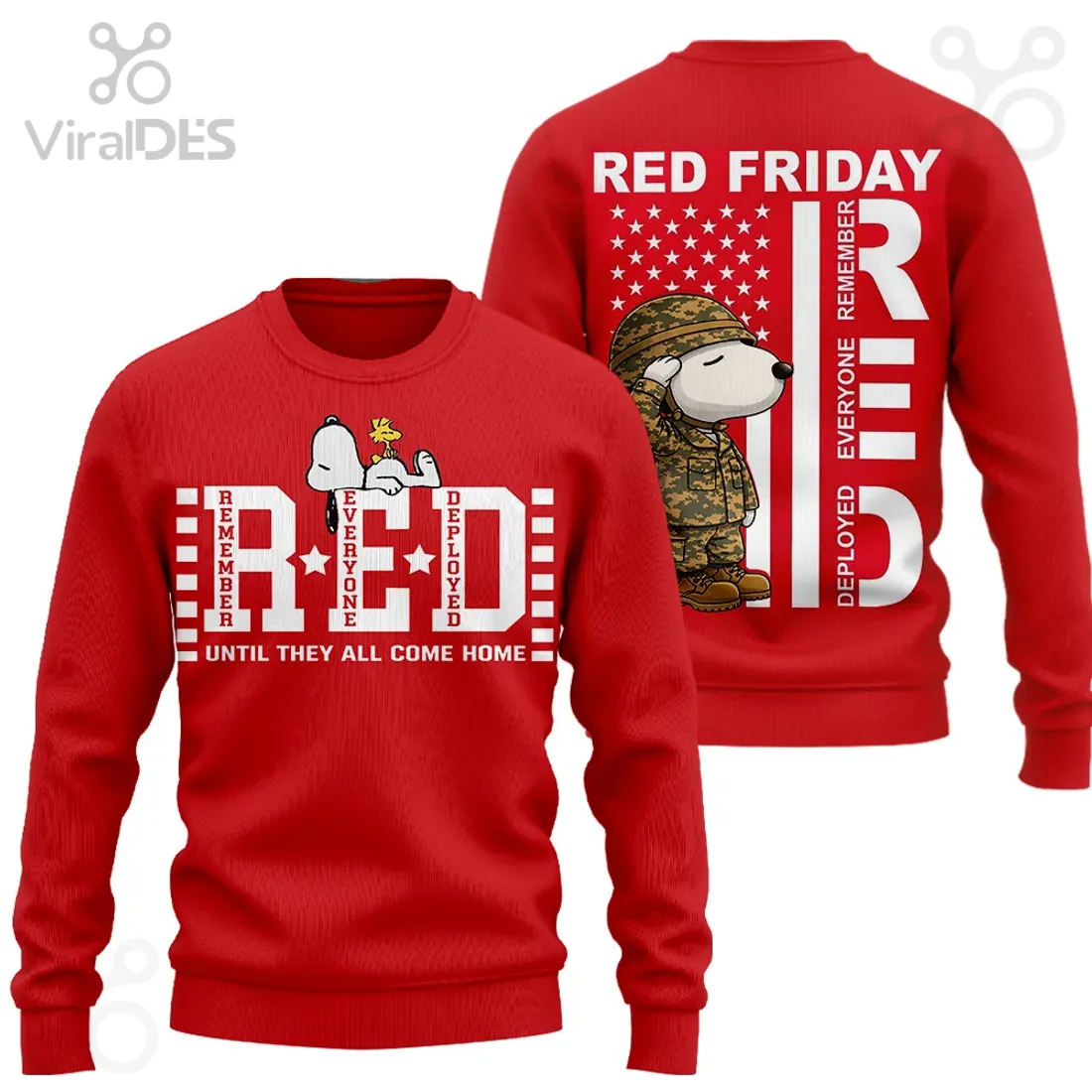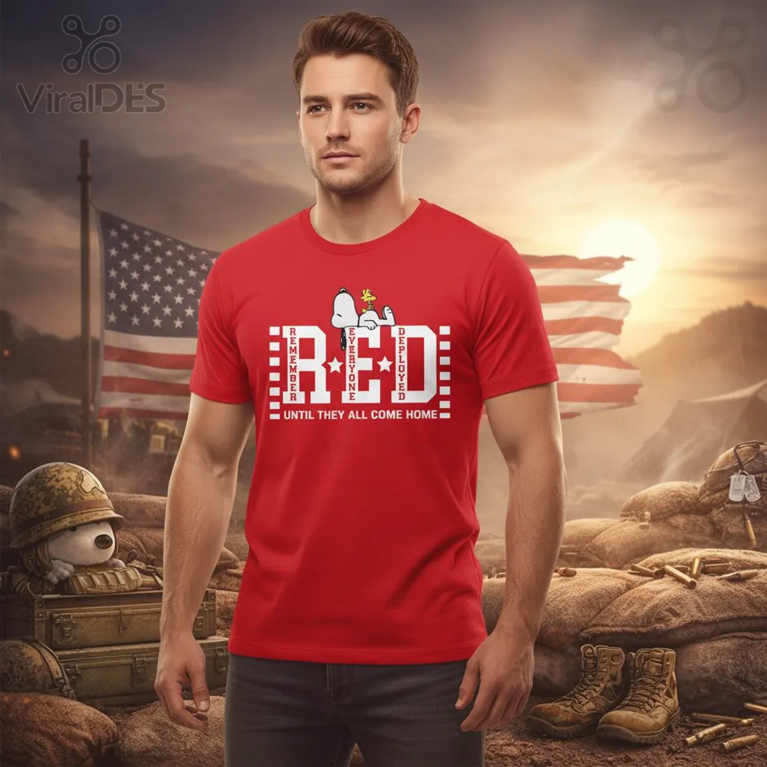 Snoopy and Woodstock are delicately placed atop the central ‘E’ of ‘RED’, offering a touch of comforting familiarity. Their serene posture subtly conveys peace and hope, softening the impactful military message with a universally loved symbol of companionship.